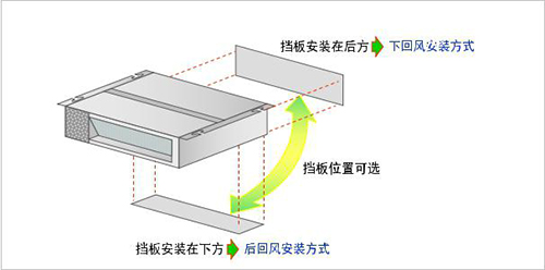 風(fēng)管式室內(nèi)機(jī)回風(fēng)擋板為可拆卸方式,通過回風(fēng)擋板位置調(diào)整,可將回風(fēng)安裝為下回風(fēng)或者后回風(fēng)方式。