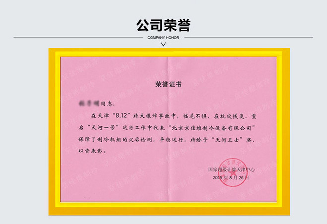 天津港“8·12”瑞海公司危險(xiǎn)品倉(cāng)庫(kù)特別重大火災(zāi)爆炸事故發(fā)生后,引起了天津、全國(guó)乃至世界的強(qiáng)烈關(guān)注,在抗災(zāi)期間,京佳維工作人員參與了重啟“天河一號(hào)”的運(yùn)行工作,我們的工作人員在危難時(shí)刻顯身手,不懼危險(xiǎn),以豐富的工作經(jīng)驗(yàn),精湛的維修技術(shù),堅(jiān)守工作職責(zé),保障了國(guó)家超級(jí)計(jì)算天津中心制冷機(jī)組的災(zāi)后監(jiān)測(cè),使機(jī)組可以恢復(fù)平穩(wěn)運(yùn)行,特給予我京佳維員工“天河衛(wèi)士”的稱號(hào),獲得國(guó)家超級(jí)計(jì)算天津中心的榮譽(yù)證書(shū),我們視這些員工為公司學(xué)習(xí)的榜樣。